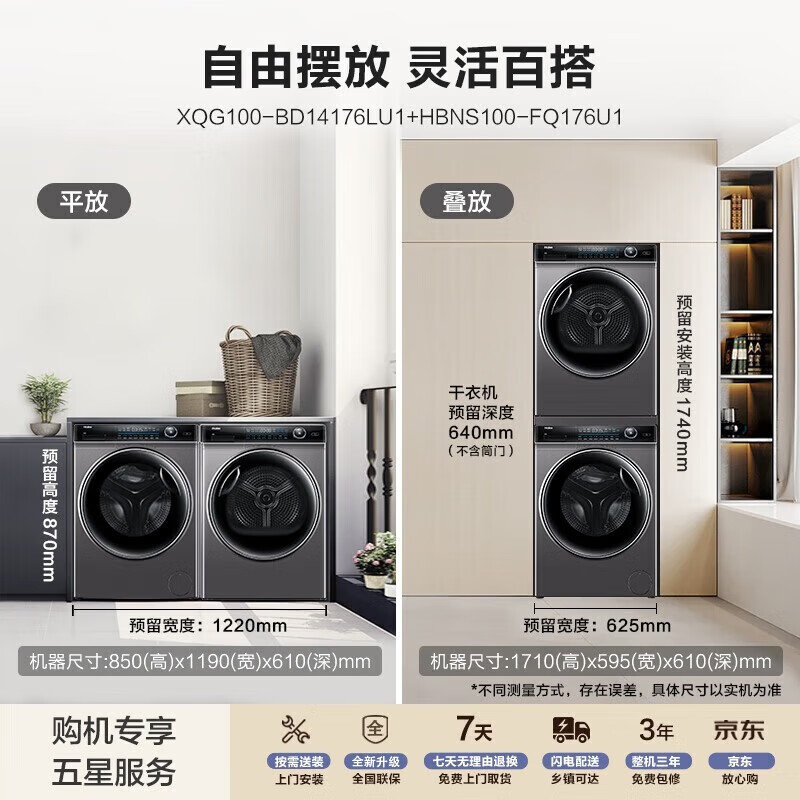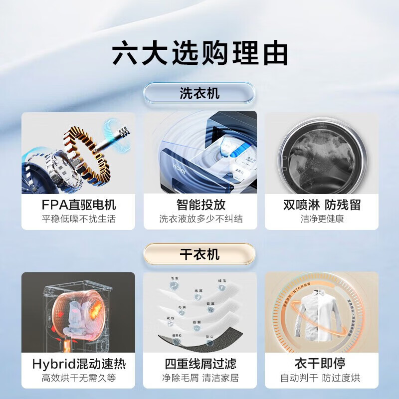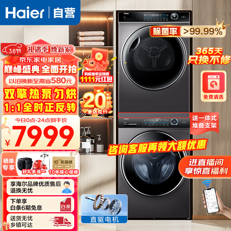 海尔(Haier)【旗舰款】纤美176+176洗烘套装紫外线水洗除菌10KG全自动家用滚筒洗衣机+双擎热泵式干衣机烘干机价格:8499.00元!