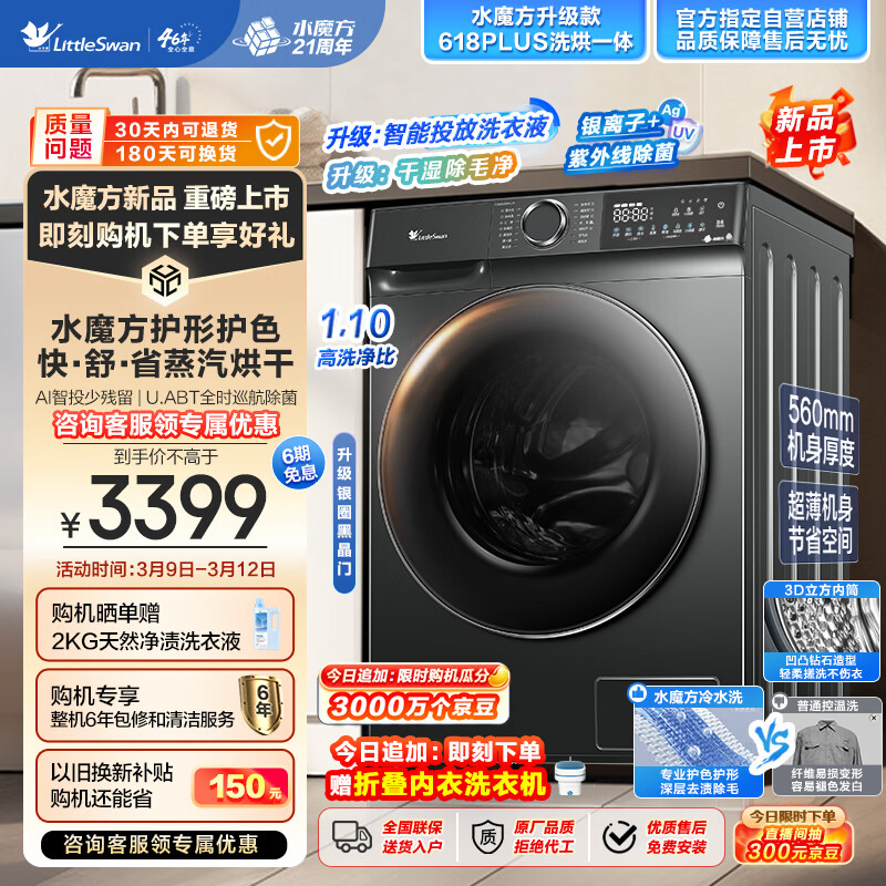 小天鹅(LittleSwan)滚筒洗衣机全自动 洗烘一体机 水魔方【TD100V618PLUS】护形护色 10公斤大容量 智能投放 蒸汽烘干价格:3399.00元!