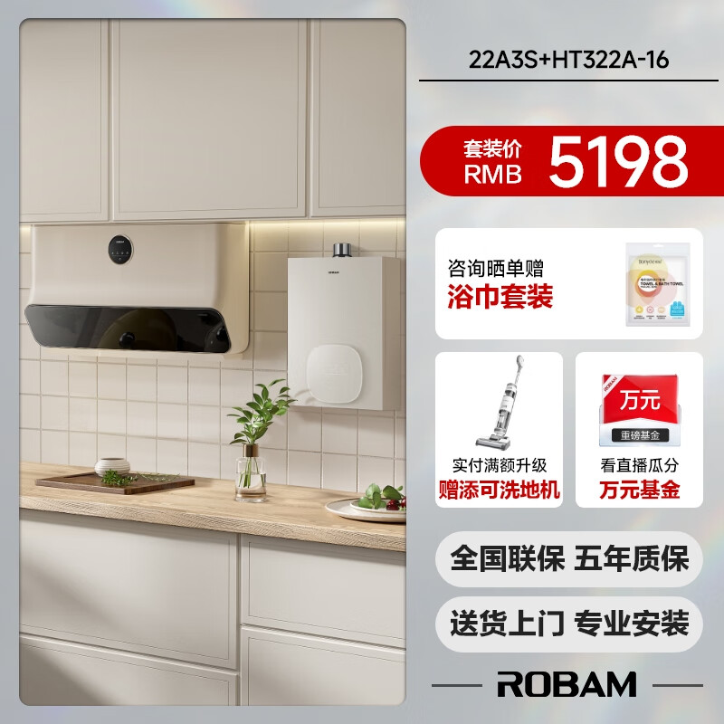 老板(Robam)抽油烟机空间大师A3S白色新物种超薄近吸23风量变频吸油烟机家用16升燃气热水器22A3S+HT322A-16价格:5198.00元!