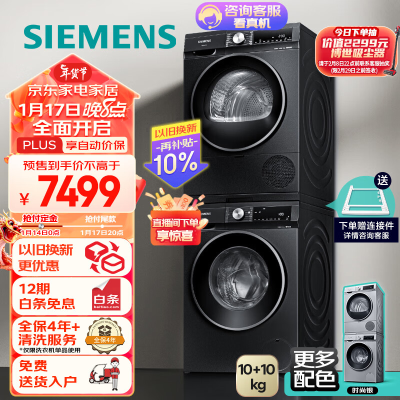 西门子(SIEMENS)iQ300曜石黑系列洗烘套装 10kg 智能除渍 滚筒洗衣机全自动+10kg 羽绒服烘 热泵烘干机 U20W+D20W价格:8299.00元!