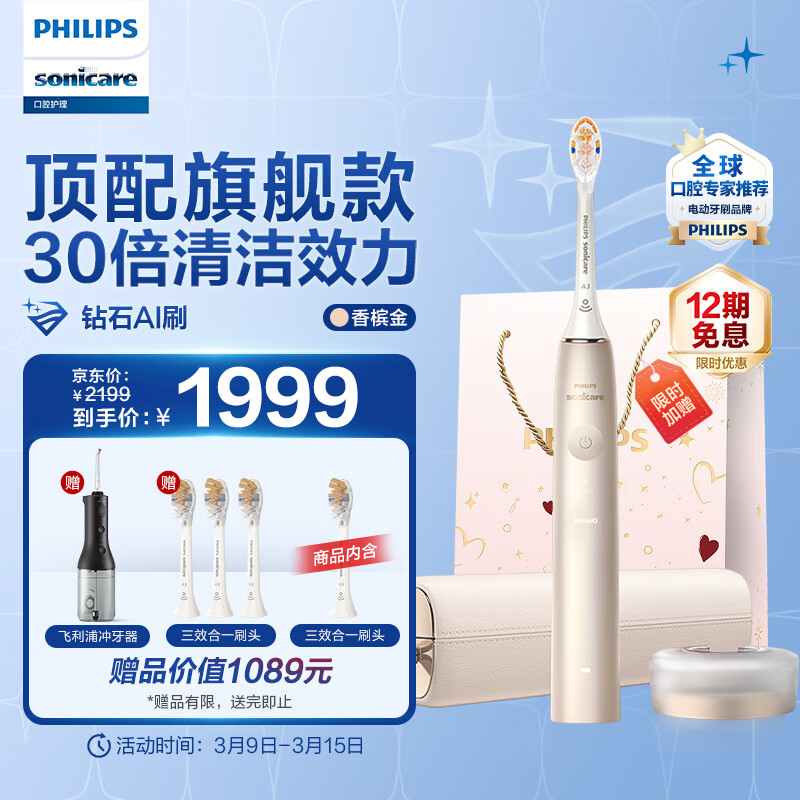 飞利浦(PHILIPS)电动牙刷情侣款送女友/男友新婚礼物含充电旅行盒20倍清除牙菌斑智能感应钻石AI刷香槟金价格:1999.00元!