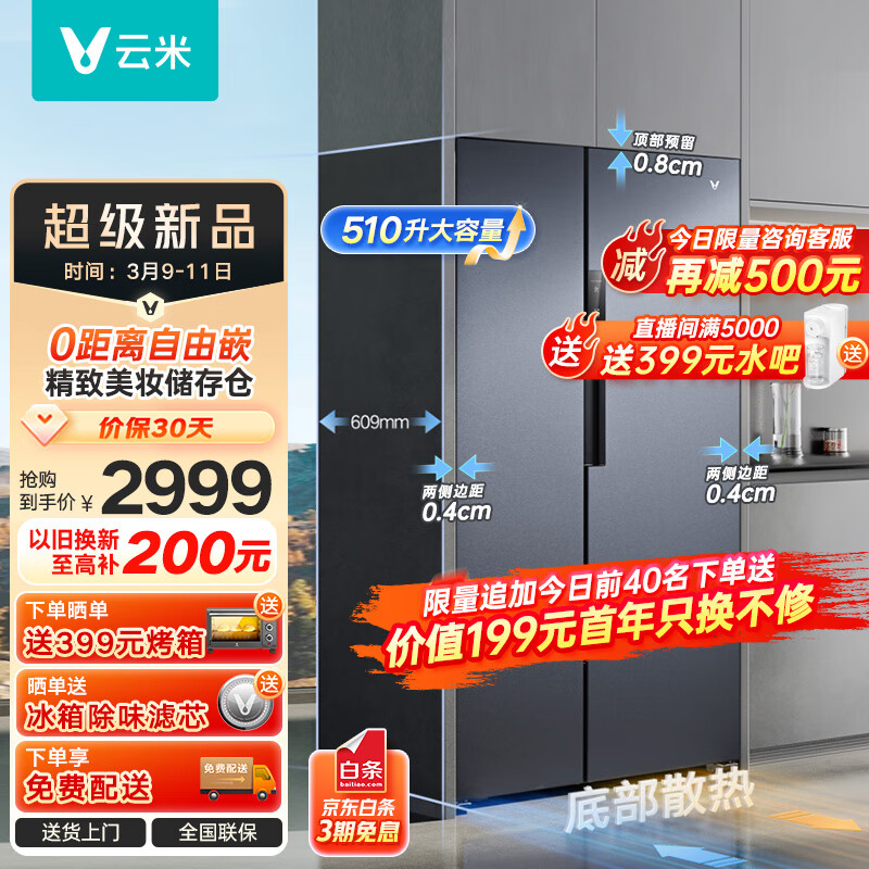 云米60+cm超薄平嵌510升大容量对开门电冰箱家用一级能效零嵌入式轻音冰箱变频底部散热BCD-510WMSAD04价格:2999.00元!