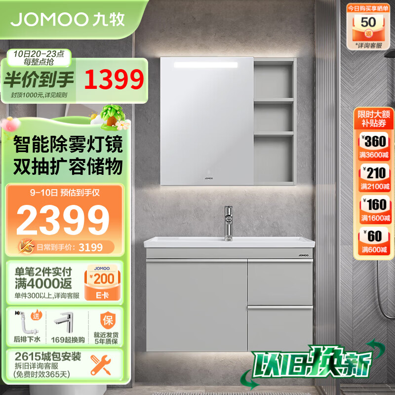 九牧(JOMOO)极简美妆智能镜浴室柜陶瓷一体洗脸盆柜组合80cm A2704-117Y-3价格:2999.00元!