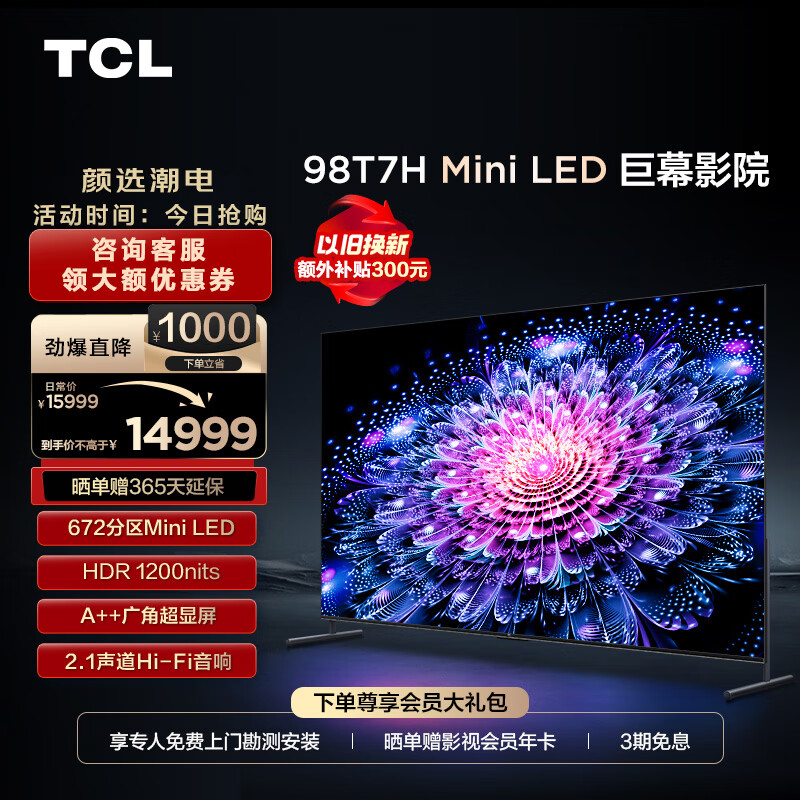 TCL电视 98T7H 98英寸 Mini LED 672分区 HDR 1200nits 4K 144Hz 2.1声道音响 液晶智能平板电视机100价格:14999.00元!