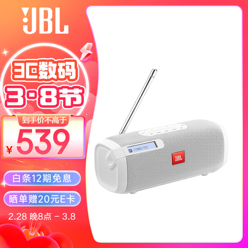 JBL TUNERFM 无线蓝牙音箱 便携式FM收音机 手机/电脑音响 老人学生机 带背光显示屏 甄选好礼 白色价格:539.00元!
