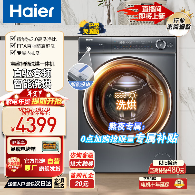 海尔滚筒洗衣机 10公斤全自动精华洗2.0 洗烘一体机 直驱变频超薄平嵌 智能投放晶彩屏 以旧换新HBD66S价格:4399.00元!