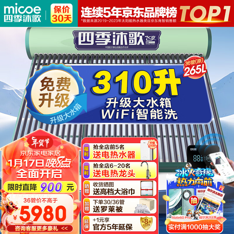 四季沐歌(MICOE)飞享WiFi太阳能热水器家用光电两用自动上水 预约电加热 水温水位显示 一级能效 上门安装36管265L价格:6880.00元!