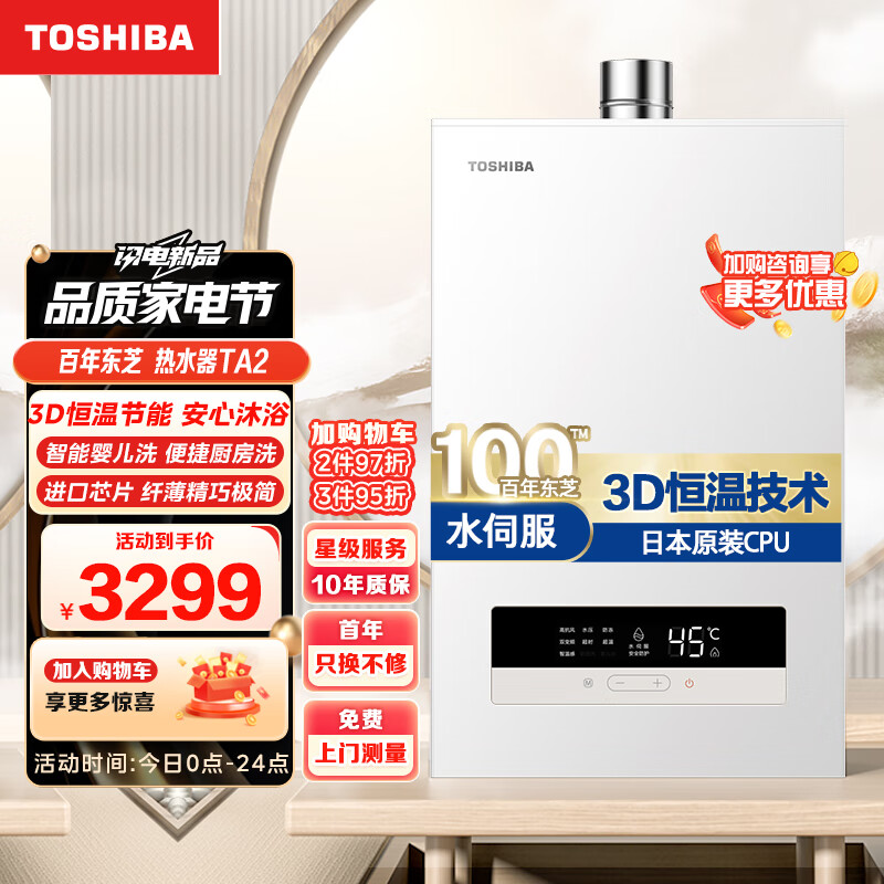 东芝(TOSHIBA) 燃气热水器16升 天然气12T 日本进口CPU 变频节能 水量伺服器JSQ30-TA2(极地白)价格:3299.00元!