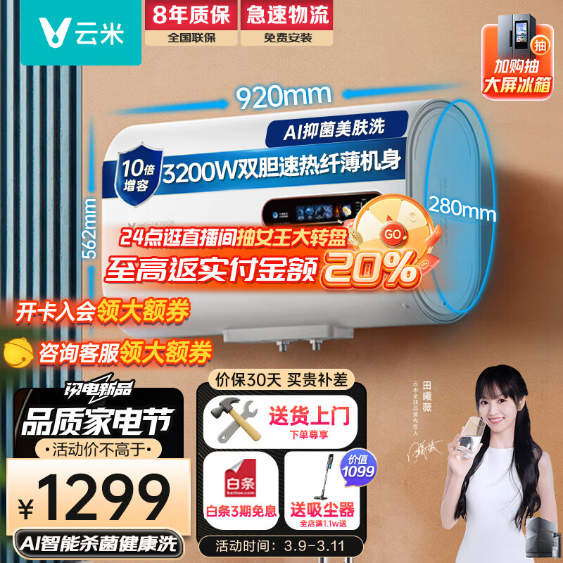 云米(VIOMI)电热水器Super 3200W双胆三管速热60升纤薄扁桶机身家用储水式热水器节能省电双重防护AI美肤洗价格:1299.00元!