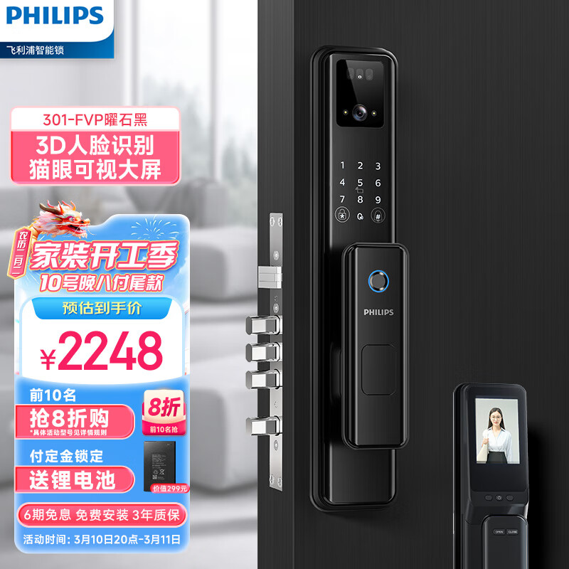 飞利浦(PHILIPS)智能锁301 智能门锁 指纹锁 密码锁防盗门锁WIFI智联按门铃抓拍 301FVP-曜石黑(人脸+大屏猫眼)价格:2498.00元!