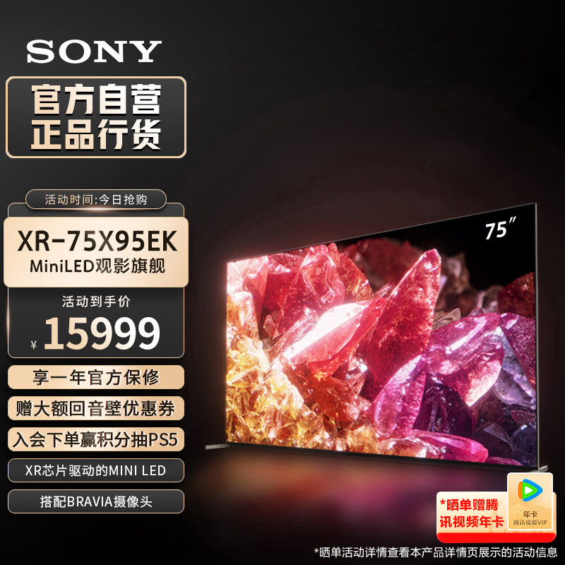 索尼(SONY)【官方直营】XR-75X95EK 75英寸 MiniLED 4K120Hz 旗舰影院电视 智能摄像头 XR认知芯片 京配上门价格:15999.00元!