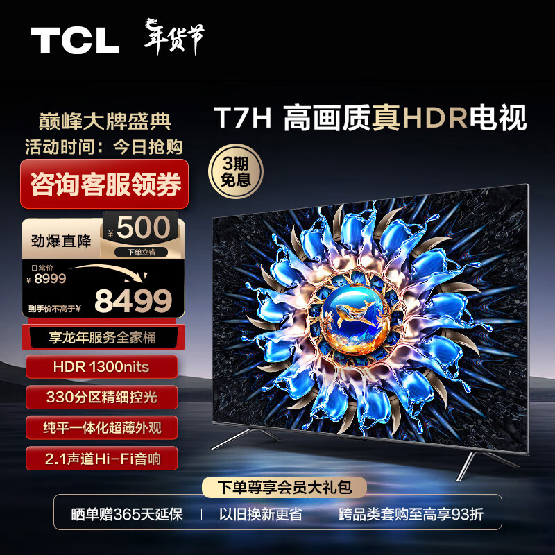TCL电视 85T7H 85英寸 HDR 1300nits 330分区 4K 144Hz 2.1声道音响 客厅液晶智能平板游戏电视机价格:7999.00元!