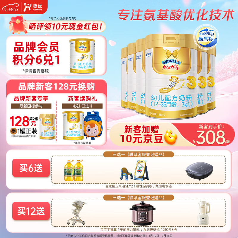 澳优(Ausnutria)荷兰进口能立多幼儿配方奶粉3段(1-3岁)860g*6罐(箱装)新国标价格:2100.00元!