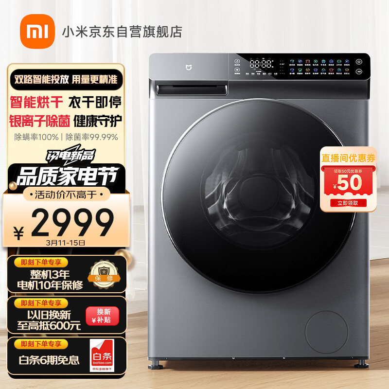 米家小米出品滚筒洗衣机全自动 10kg尊享版洗烘一体 直驱电机双路智能投放炫彩触控屏 XHQG100MJ203价格:2999.00元!