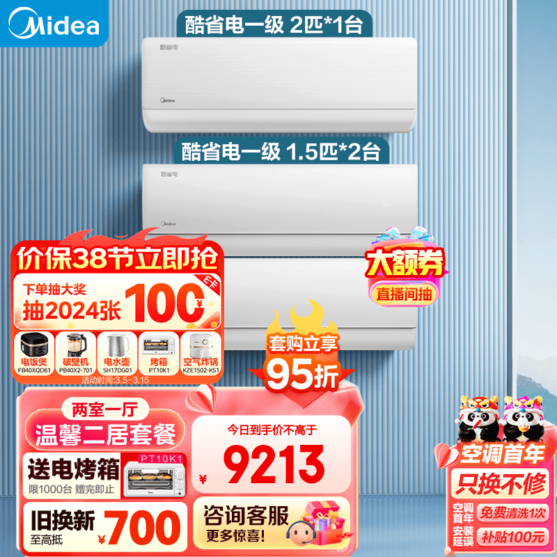 美的(Midea)酷省电空调系列温馨两居套餐(1.5匹酷省电*2+2匹酷省电)一站购齐套购价格:9697.00元!