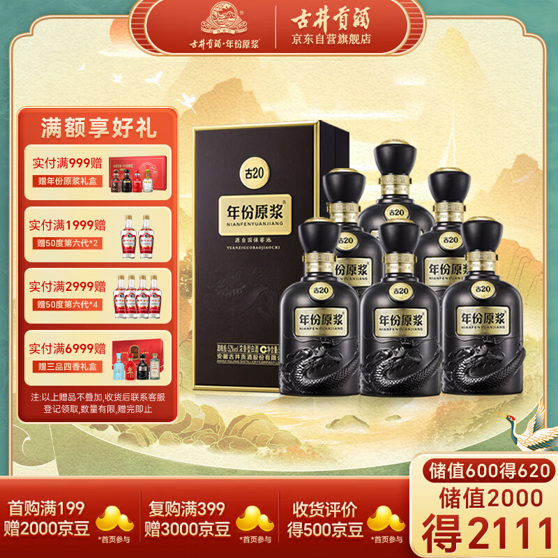 古井贡酒年份原浆 古20 浓香型白酒 52度500ml*6瓶 整箱装(内含礼品袋)价格:5280.00元!