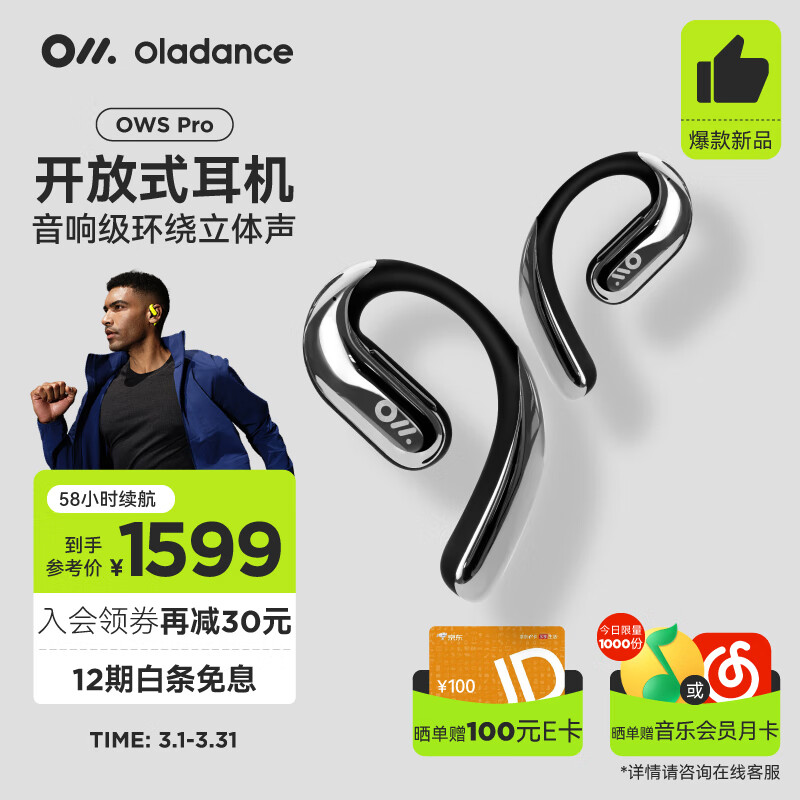 OladanceOWS Pro 全开放式耳机(含充电仓)无线蓝牙不入耳防漏音运动耳机超长续航【ola小月牙】 皓光钛银价格:1599.00元!