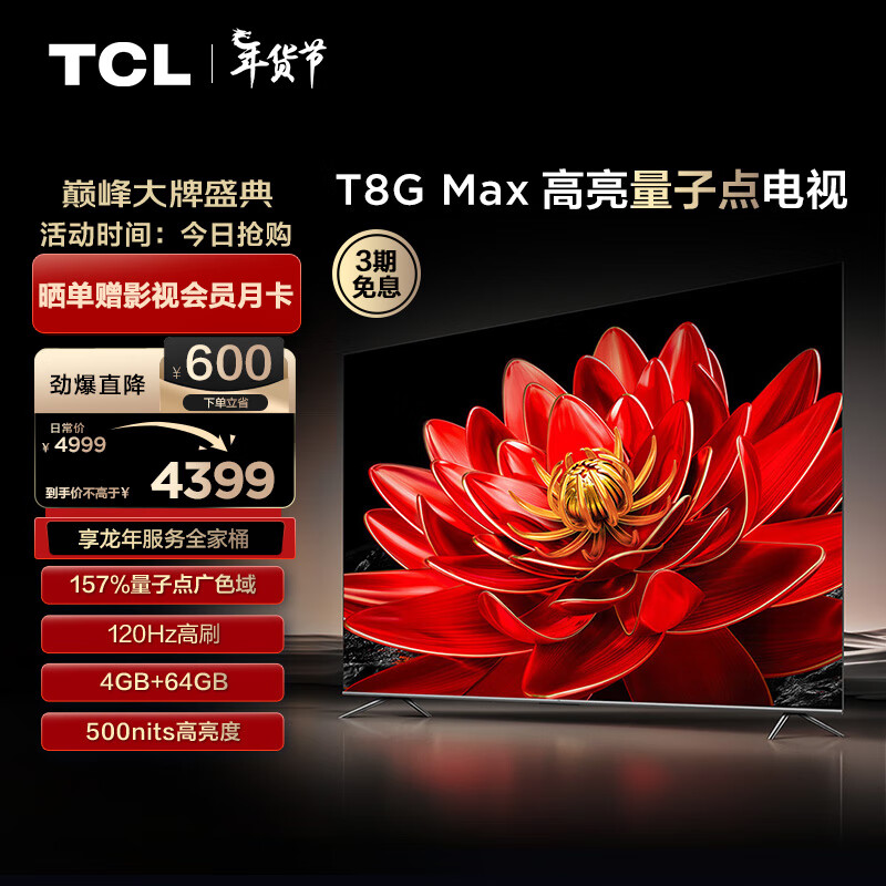 TCL电视 75T8G Max 75英寸 QLED量子点 120Hz 4+64GB 护眼 4K超高清 客厅液晶智能平板游戏电视机价格:4399.00元!