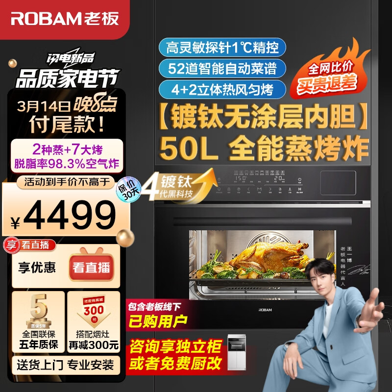 老板(Robam)CQ976D蒸烤箱一体机嵌入式50L家用全能蒸烤炸3合1蒸箱烤箱空气炸专业1℃精控三重自清洁釉感自净价格:4498.00元!