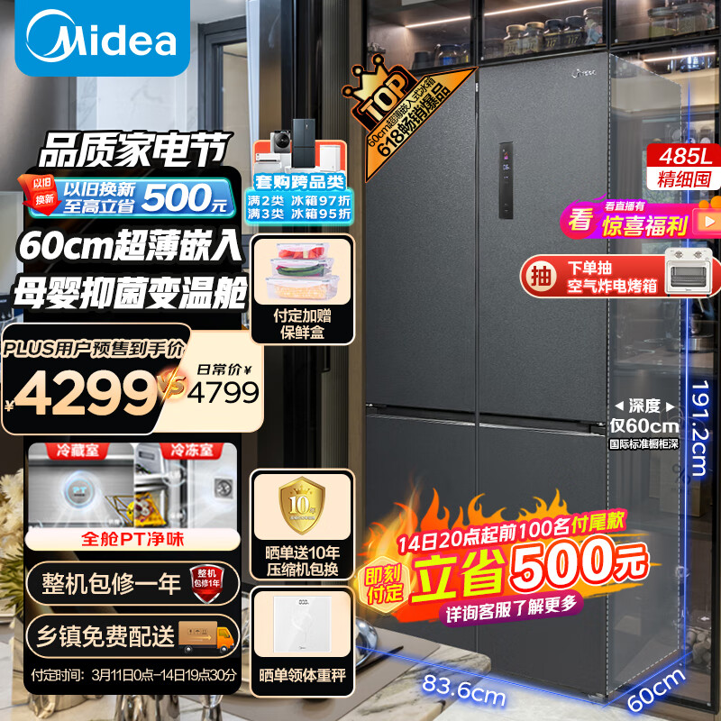 美的(Midea)60cm薄系列485升十字对开双开门四开门超薄可嵌入家用智能电冰箱一级变频BCD-485WSPZM(E)大容量价格:4799.00元!