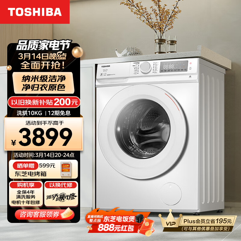 东芝(TOSHIBA)滚筒洗衣机全自动【小玉兔DD-107T13B】洗烘一体机 10公斤大容量 UFB超微泡 热平衡烘干 以旧换新价格:3899.00元!