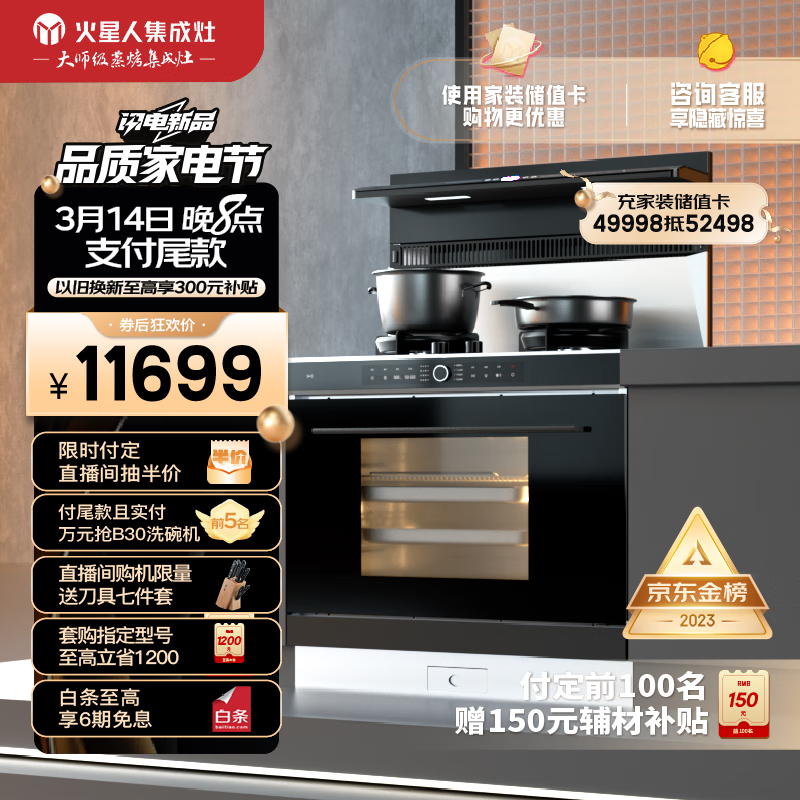 火星人集成灶 ET50BC Pro 集成灶一体式 变频22风量大吸力抽油烟机 集成蒸烤箱一体机 4.5kW燃气灶液化气价格:11799.00元!