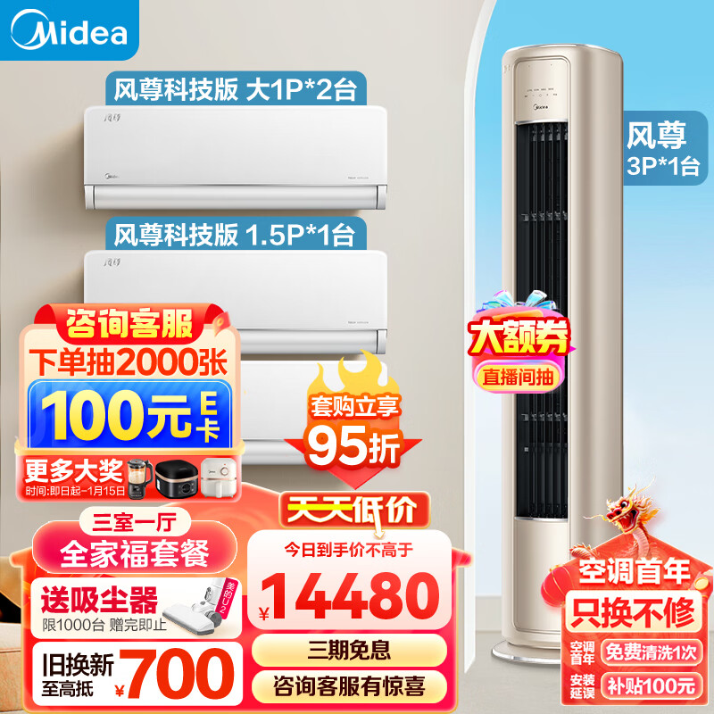 美的(Midea)空调 风尊系列 全家福套餐 三室一厅套装(大一匹风尊科技版*2+1.5匹风尊科技版+3匹风尊柜机)价格:15346.00元!