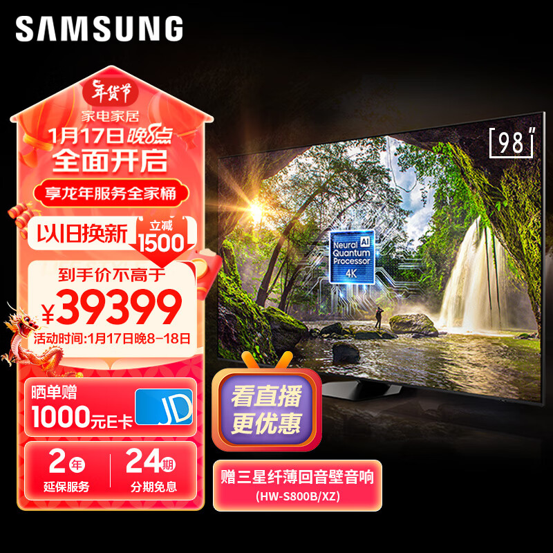 三星(SAMSUNG)98Q80Z 98英寸QLED量子点 AI智能补帧120Hz高刷 平板液晶电视 无开机广告 QA98Q80ZAJXXZ 100价格:39399.00元!