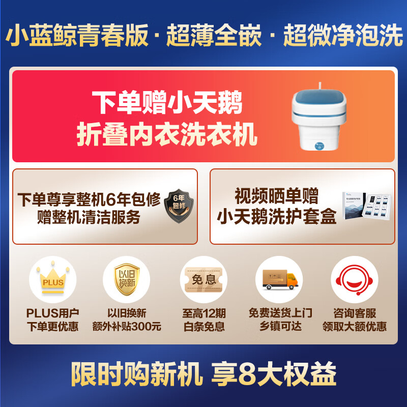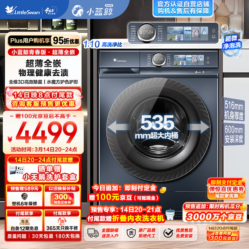 小天鹅(LittleSwan)滚筒洗衣机全自动【小蓝鲸青春版TG100V86PLUS】超薄全嵌 超微净泡洗 护色水魔方 1.1洗净比10公斤价格:4598.00元!