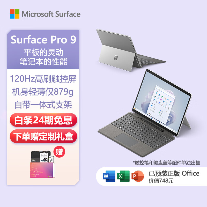 微软Surface Pro9 二合一平板电脑 i5/16G/256G亮铂金13英寸触控学习机 高端办公 游戏轻薄 笔记本电脑价格:10588.00元!