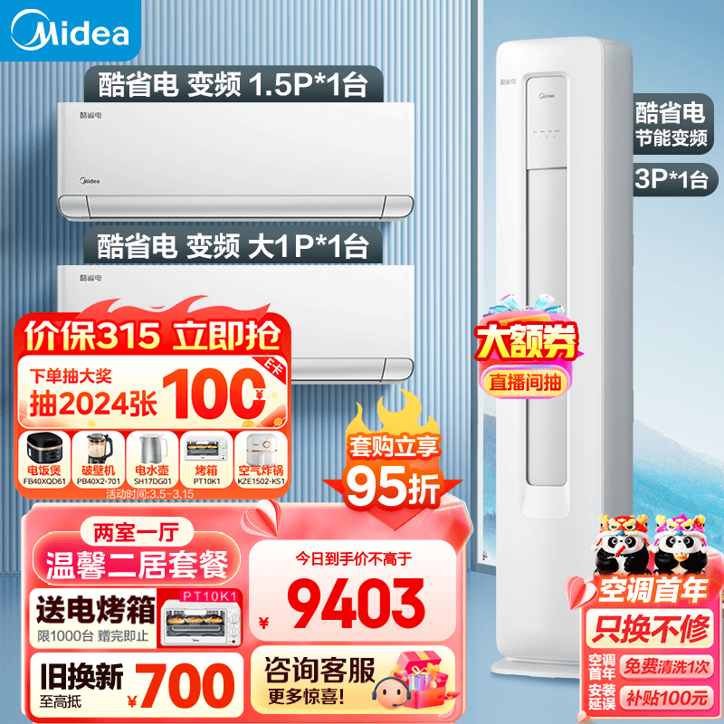 美的(Midea)新能效 酷省电 空调套装 两室一厅 温馨二居套餐 (大1匹+1.5匹+3匹)价格:9897.00元!