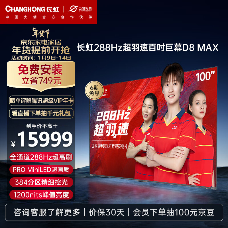 长虹电视100D8 MAX 100英寸4K超高清巨幕影院 288Hz MiniLED 1200nit峰值亮度 大屏智能平板液晶电视机价格:15999.00元!
