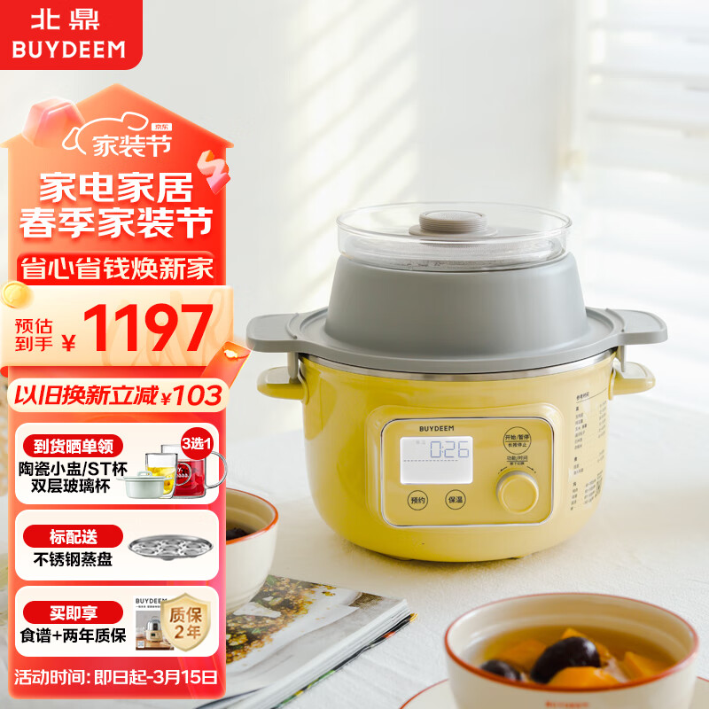 北鼎(Buydeem)家用迷你电煮锅电火锅多功能全自动预约多用途锅 【小鹅黄G37 含炖盅+陶瓷蒸蛋盘】价格:1197.00元!