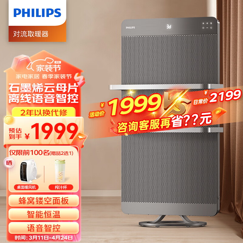 飞利浦(PHILIPS)石墨烯取暖器家用电暖器暖风机云母片电暖气片多档恒温语音遥控定时对流速热节能电热膜 AHR5144CS价格:2499.00元!