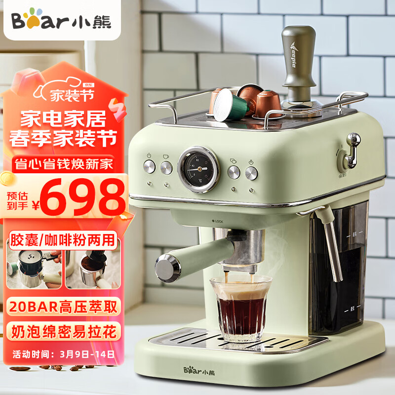 小熊(Bear)咖啡机家用意式泵压式20Bar高压喷射可打奶泡1.2升大容量 咖啡粉/咖啡胶囊/两用KFJ-E12Q5价格:698.00元!