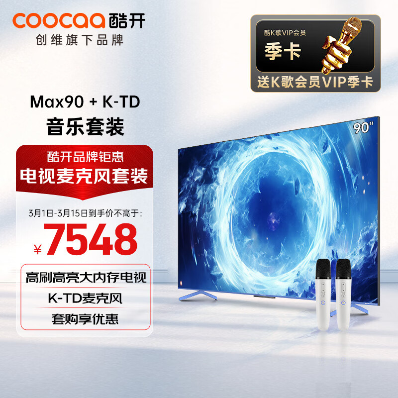 酷开创维 90英寸高刷高亮高分区电视机Max90+K-TD双支麦克风套装 K歌电视 家庭KTV无线话筒唱歌会议价格:7548.00元!