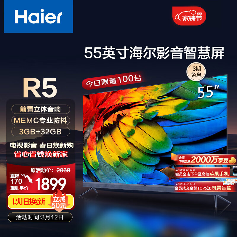 海尔(Haier)55R5 55英寸超薄金属屏 前置立体音响 4K超高清 MEMC运动防抖 声控智慧屏 3GB+32GB大内存价格:1899.00元!