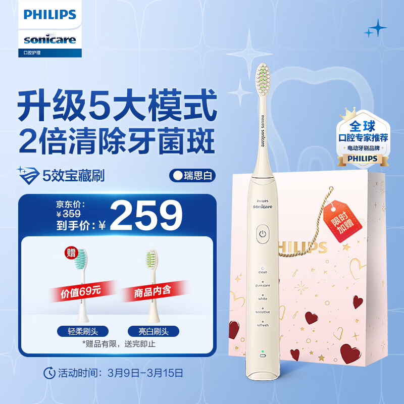 飞利浦(PHILIPS)电动牙刷成人情侣款 送女友/男友礼物软毛柔和亮白刷头5效宝藏刷 瑞斯白HX2471/03价格:259.00元!