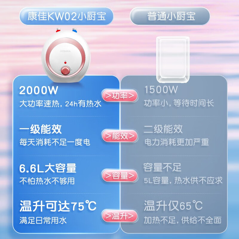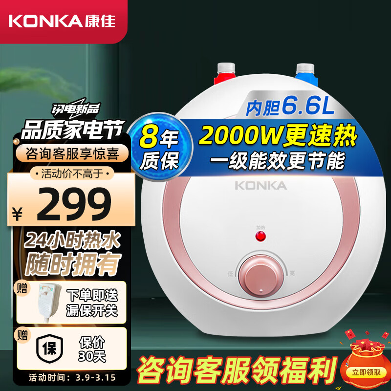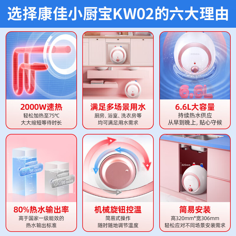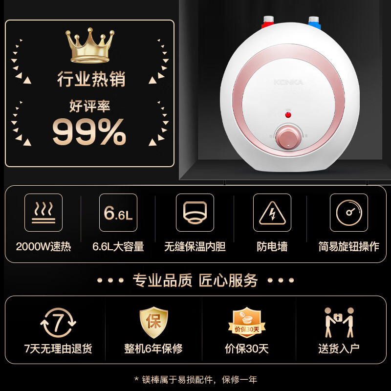康佳(KONKA)小厨宝 一级能效6.6升家用电热水器 2000W速热节能 小尺寸厨房橱柜安装DSZF-KW02(自行安装)价格:299.00元!