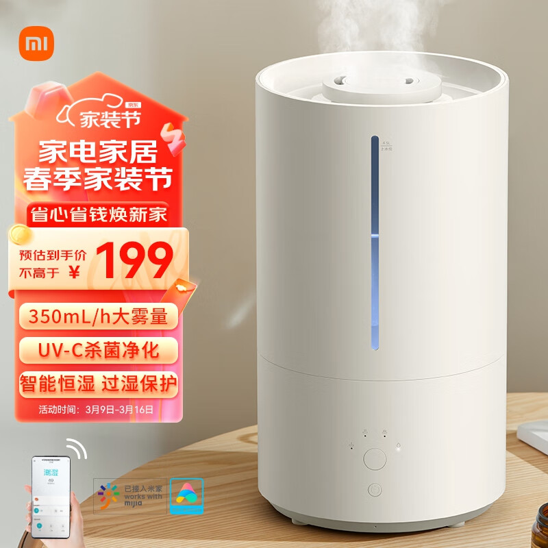 米家小米智能除菌加湿器2 卧室轻音杀菌大雾量 孕妇婴儿 智能恒湿上加水 4.5L大容量价格:199.00元!