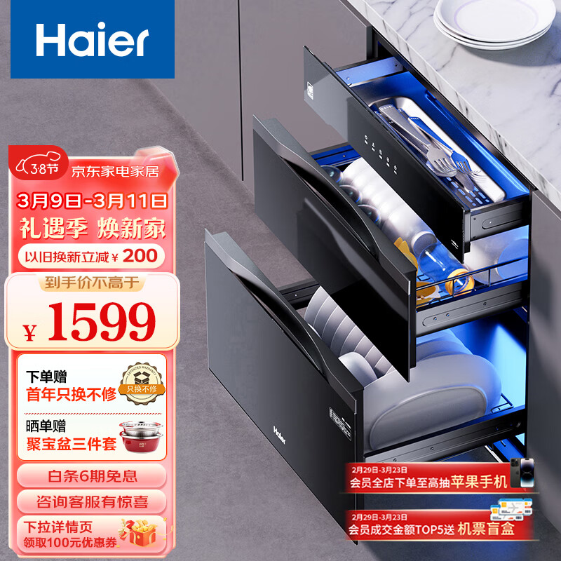 海尔(Haier)消毒柜家用嵌入式 消毒碗柜 奶瓶消毒烘干一体机 光波巴氏消毒新升级 母婴童锁 110L三门三抽EB031价格:1599.00元!