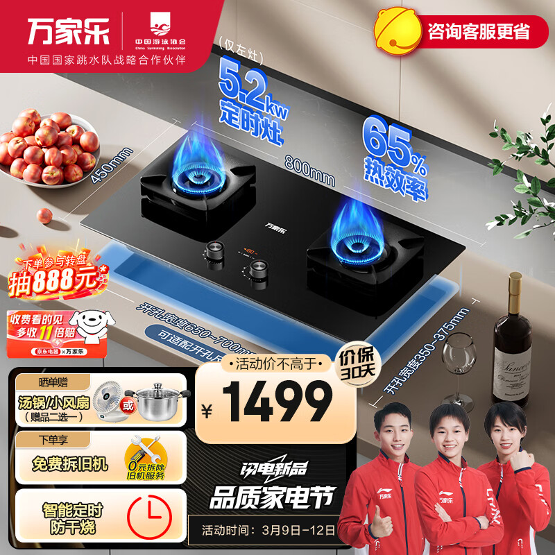 万家乐燃气灶天然气灶5.2kW猛火灶 家用智能防干烧定时三防灶台嵌两用全进风铜火盖可拆炉头灶具JZT-AC7A价格:1499.00元!