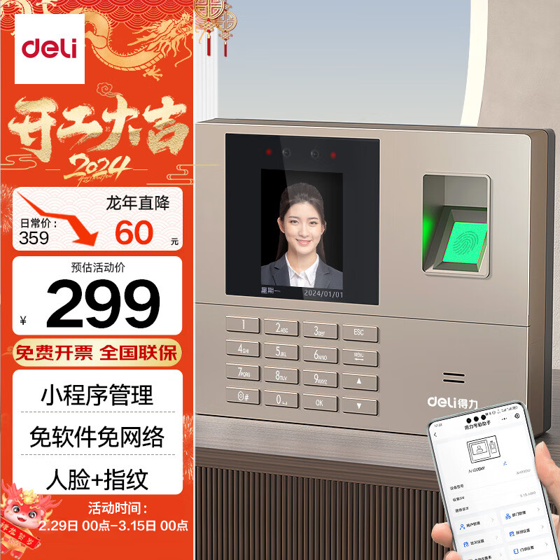 得力智能考勤机 打卡机人脸+指纹 打卡考勤机 蓝牙连接 小程序管理 无需网络 小程序升级版33800W价格:339.00元!