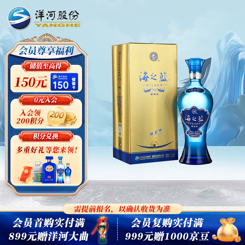 洋河 蓝色经典 海之蓝 口感绵柔浓香型白酒 52度 520ml 单瓶装 旗舰版价格:188.00元!