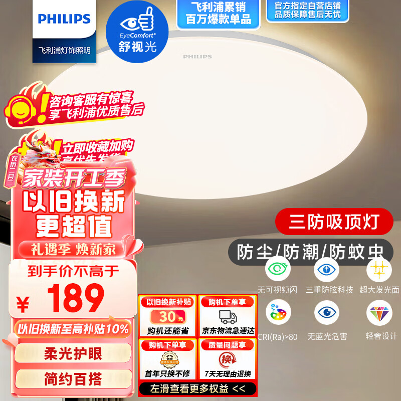 飞利浦(PHILIPS)led吸顶灯卧室灯客厅灯书房餐厅儿童房简约灯饰灯具36W40K恒妍价格:189.00元!