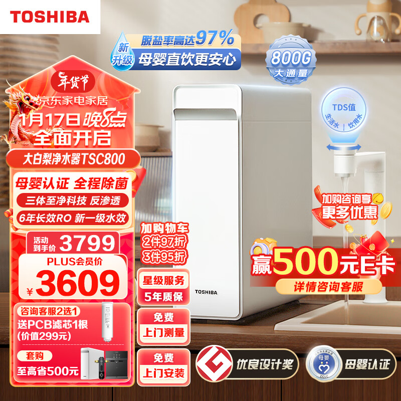 东芝(TOSHIBA)净水器家用净水机 大白梨800G 厨下式净水器直饮机TSC800 6年RO反渗透过滤器 0陈水 净洗分离价格:3999.00元!
