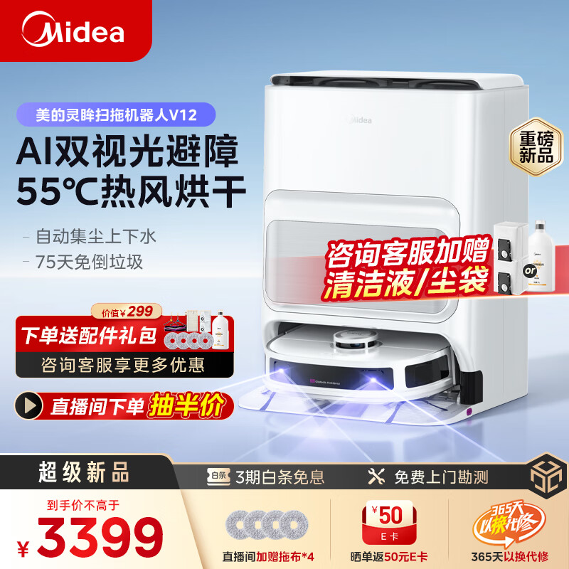 美的(Midea)扫地机器人扫拖一体 灵眸V12极地白 自动集尘上下水扫拖洗烘一体机自动清洗拖布拖地机价格:3699.00元!