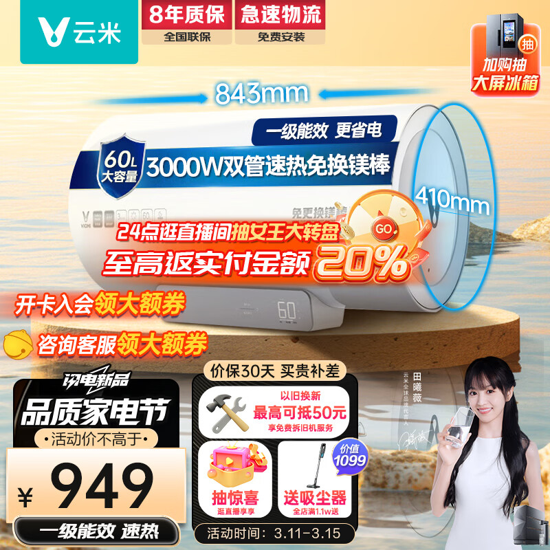 云米(VIOMI)电热水器3000W免换镁棒双管电热水器60升家用APP智控 一级能效VEW6010【速热健康洗】价格:949.00元!