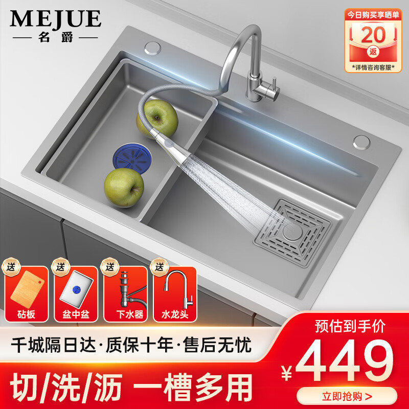 名爵(MEJUE)枪灰色水槽厨房纳米不锈钢龙头洗碗池洗菜盆阶梯式水盆Z-02461价格:509.00元!
