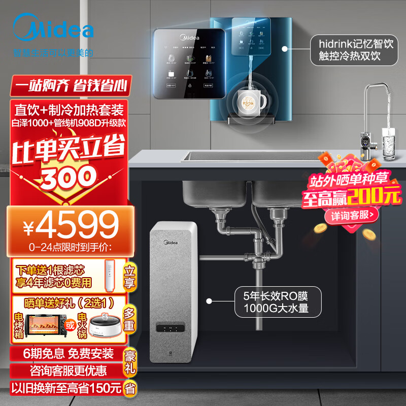 美的(Midea)直饮冷热净水器套装【白泽1000+管线机908D升级版】hidrink智能 家用壁挂式即热一体净饮机价格:4599.00元!